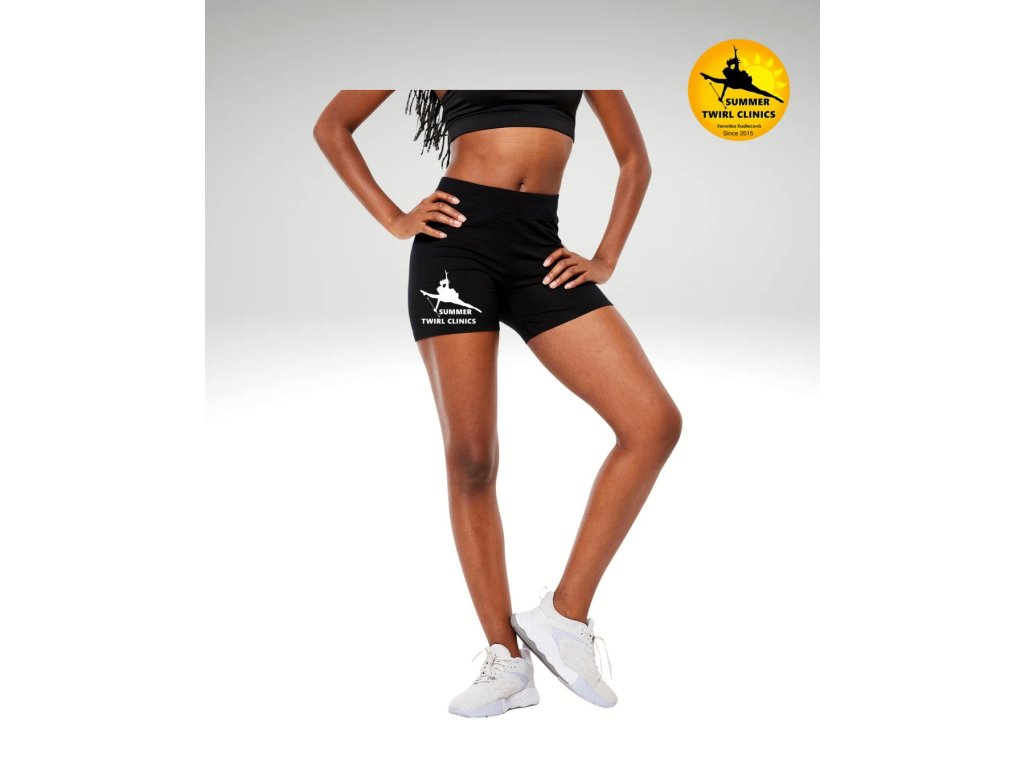 Černé sportovní šortky s bílým potiskem loga letního twirlingového campu Summer Twirl Clinics.